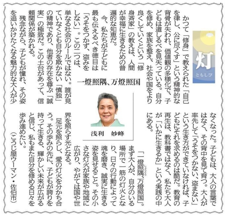 2026年2月28日(土)、大分合同新聞「灯」に『一燈照隅、万燈照国』と題した こうじ屋ウーマン 浅利妙峰のコラムが掲載されました。 紙面改革に伴い、この「灯」のコーナーは2026年3月末で終了します。浅利妙峰の「灯」は…